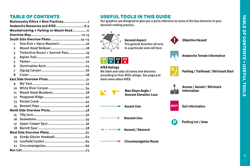You’ll find high-quality aerial photos marked with ascent and descent indicators, individual run descriptions, slope angles, aspect, Avalanche Terrain Exposure Scale ratings, parking and trailhead information, and more in a lightweight book that can fit in your pack. Designed to go along with you on your tours and accompany the Backcountry Skiing Mount Hood Ski Map and Ski App.