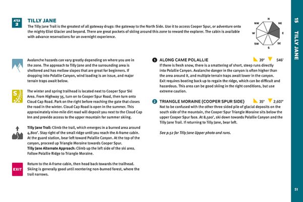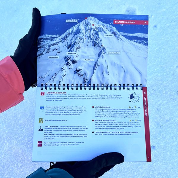 This 5.5” x 8.5” spiral-bound book covers the following zones: Tom Dick + Harry Mountain, Mount Hood Skibowl, Timberline Resort/Summit Pass, Alpine Trail, Palmer, Illumination Rock, Zigzag Canyon, Crater, Wy’ East, White River Canyon, Mount Hood Meadows, Peagravel Ridge, Pocket Creek, Bennett Pass, Tilly Jane, Snowdome, Upper Copper Spur, Barrett Spur, Sandy Glacier Headwall, Leuthold Couloir, Circumnavigation.