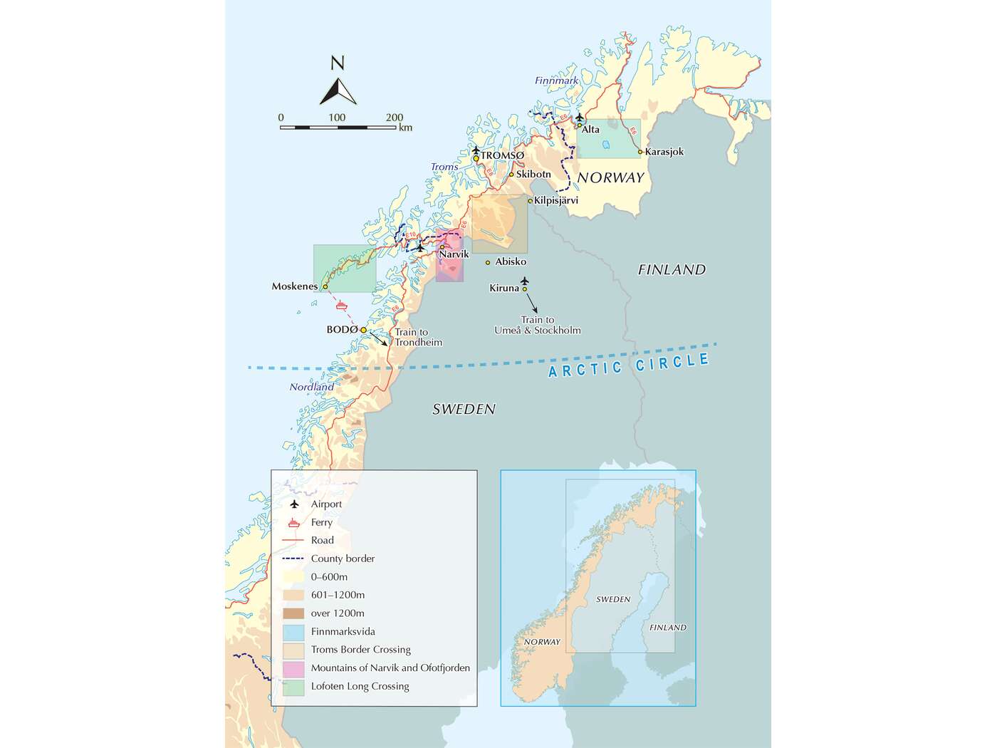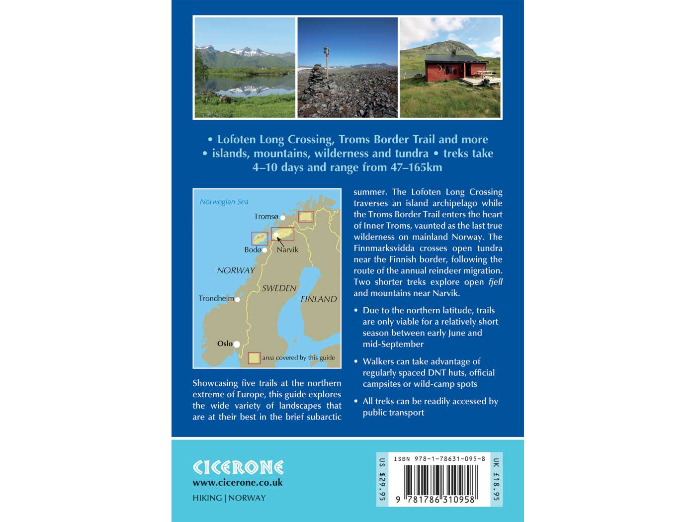 Each of the five multi-day hikes (the Lofoten Long Crossing, the Mountains of Narvik, the Mountains of Ofotfjorden, the Troms Border Trail and Finnmarksvidda) are described in detail, with accommodation, facilities and transport options highlighted, and alternative itineraries listed where relevant. Some of the trails criss-cross over the border into neighbouring Sweden and Finland.