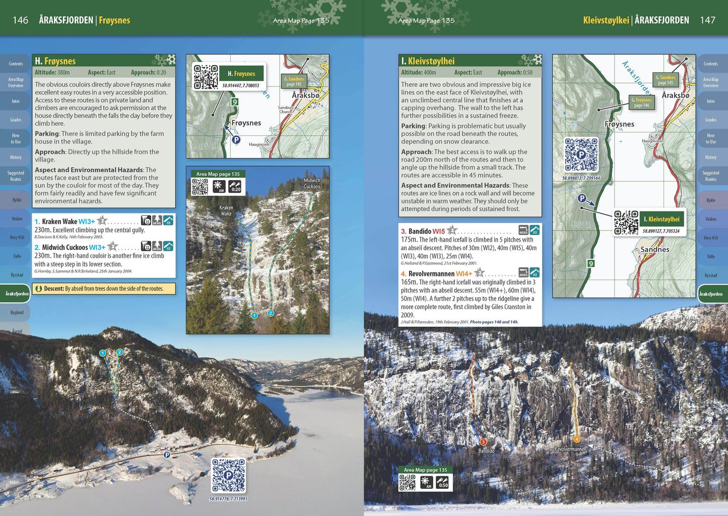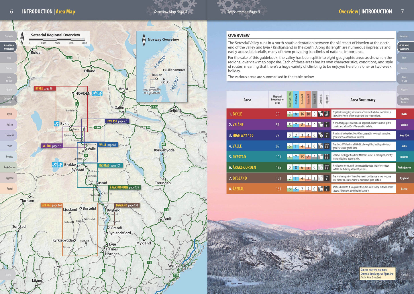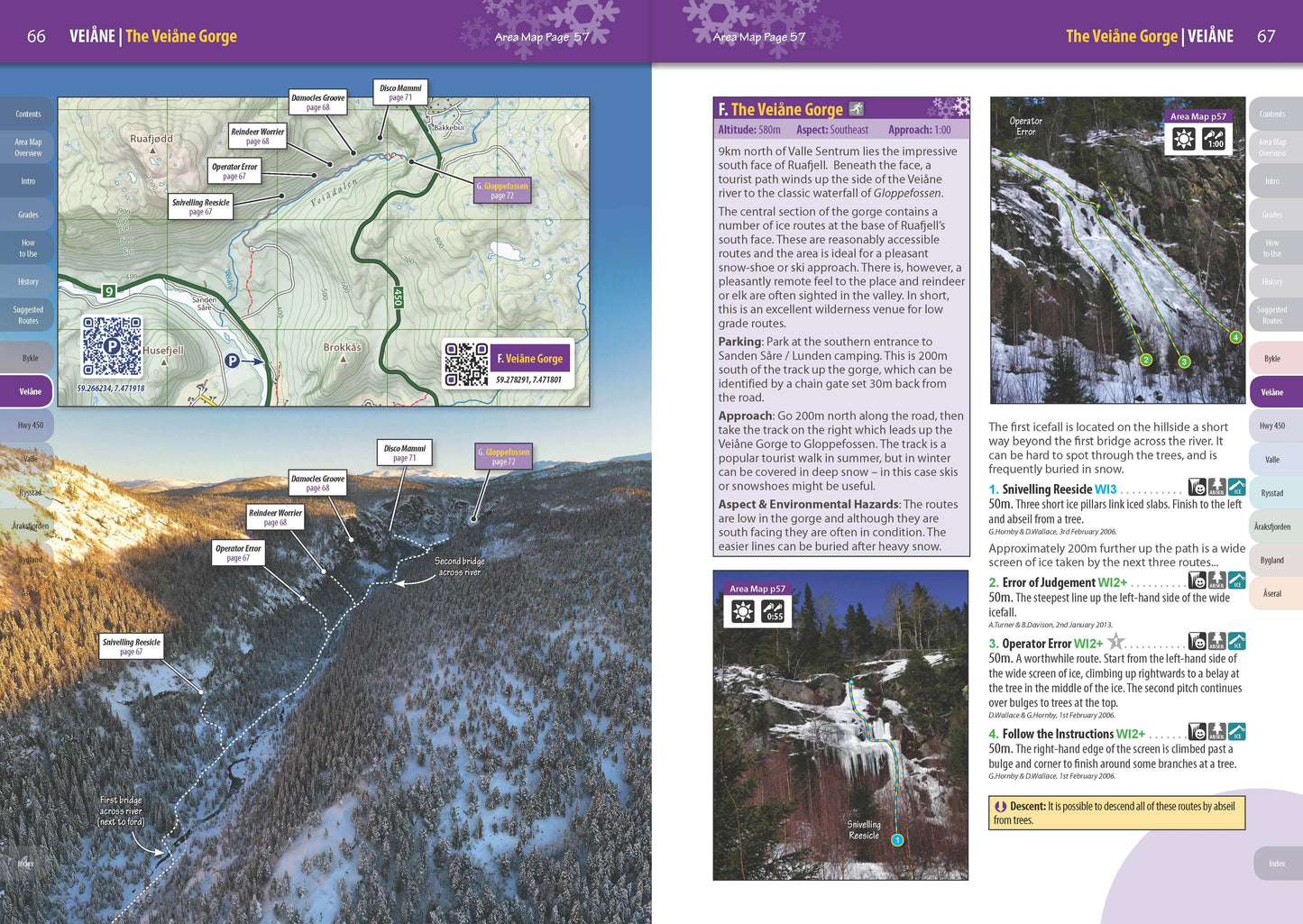 Each climb has comprehensive access and route descriptions along with difficulty levels and info on descents and hazards. The topo images are super clear and numerous. This is an essential guidebook for anyone looking to go ice climbing in Setesdal.