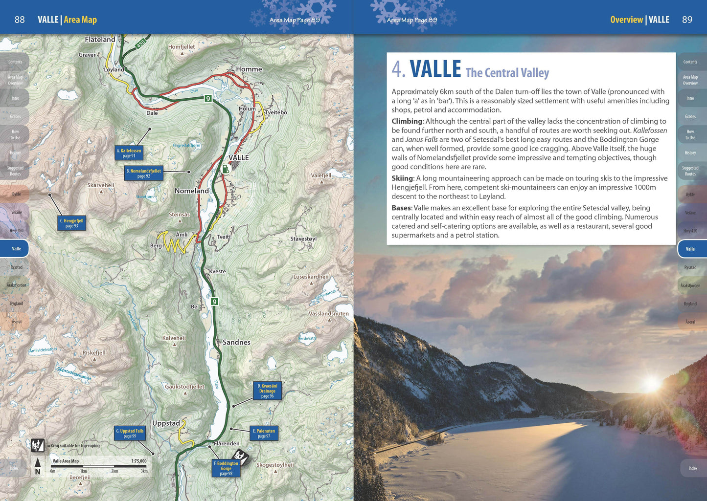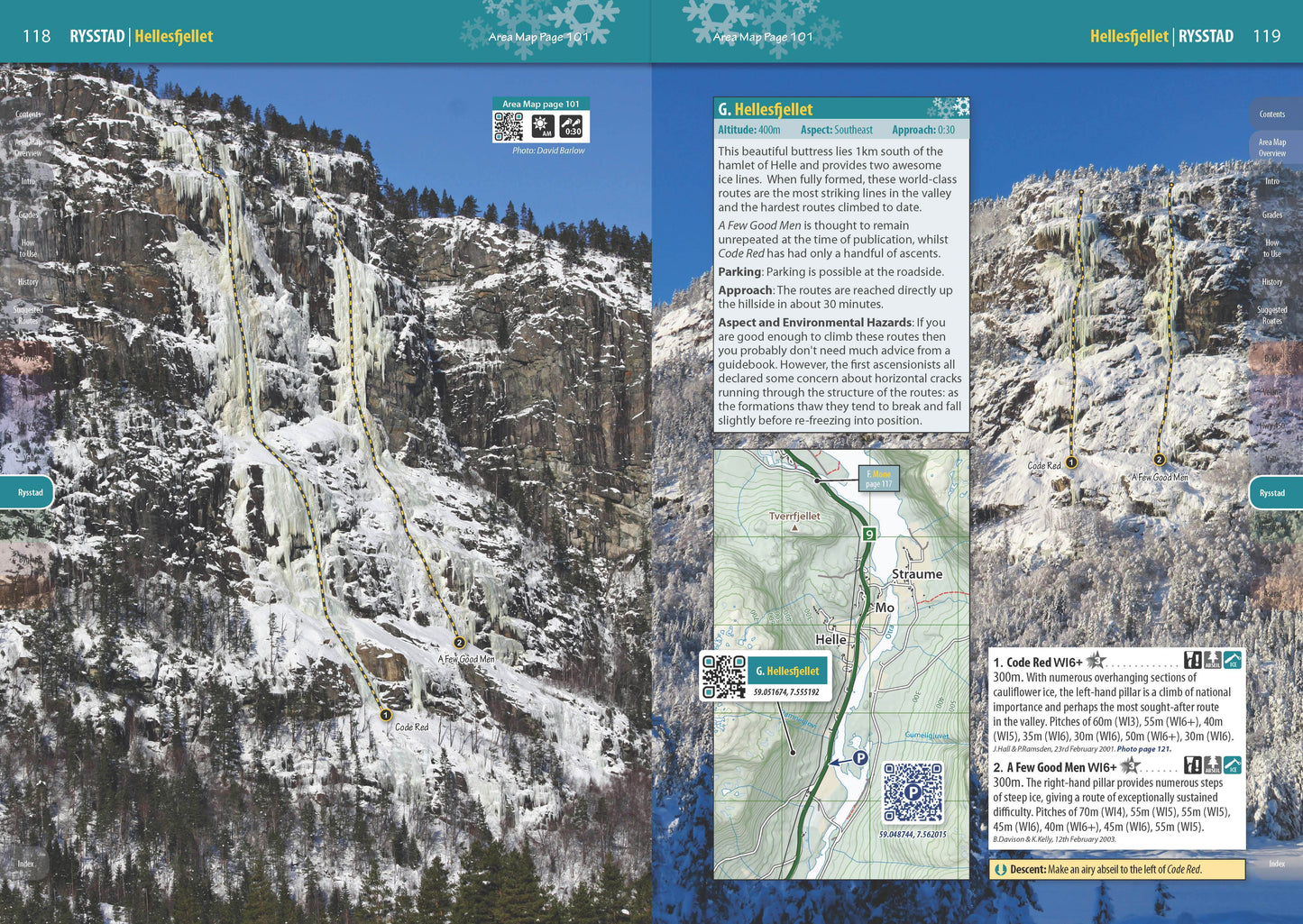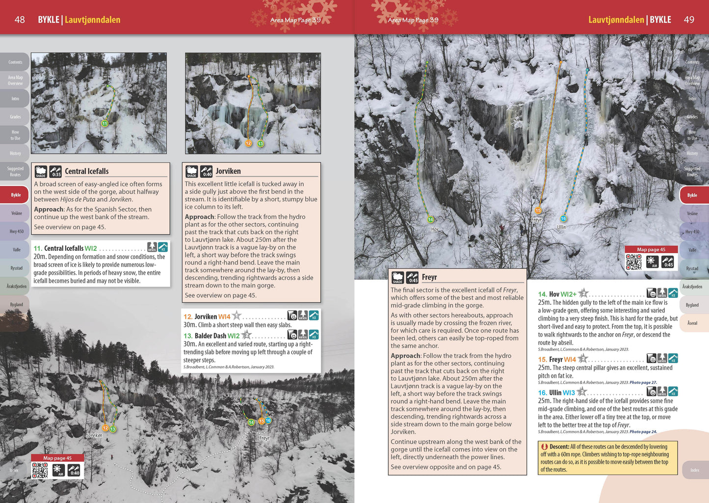 Each climb has comprehensive access and route descriptions along with difficulty levels and info on descents and hazards. The topo images are super clear and numerous. This is an essential guidebook for anyone looking to go ice climbing in Setesdal.